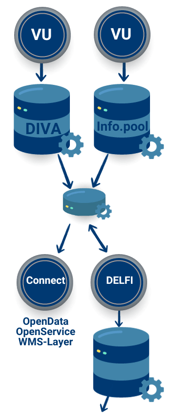 Versorgung der norddeutschen Auskunftssysteme und der Connect-Services wie OpenData Portal, OpenService und WMS-Layer.